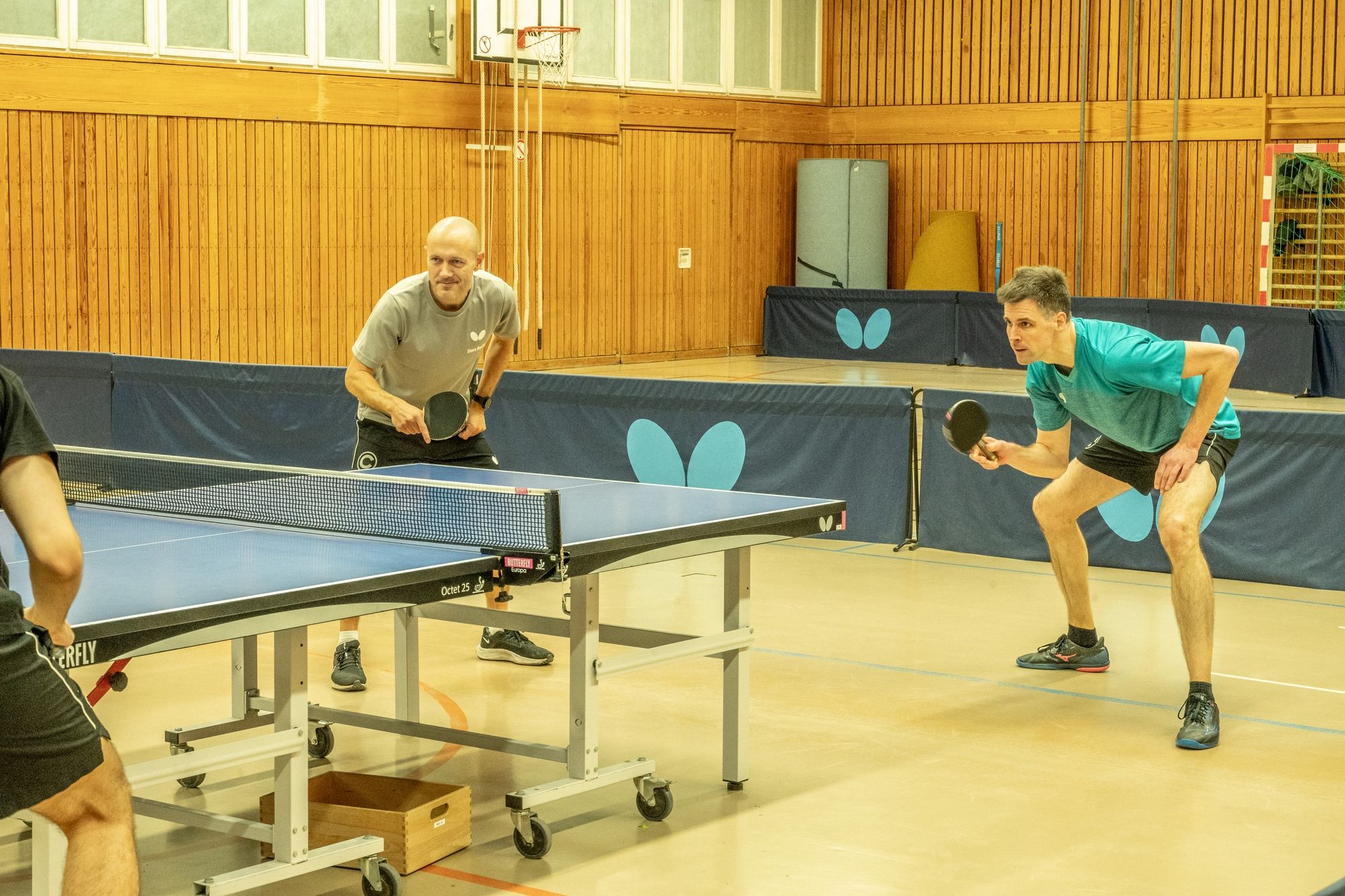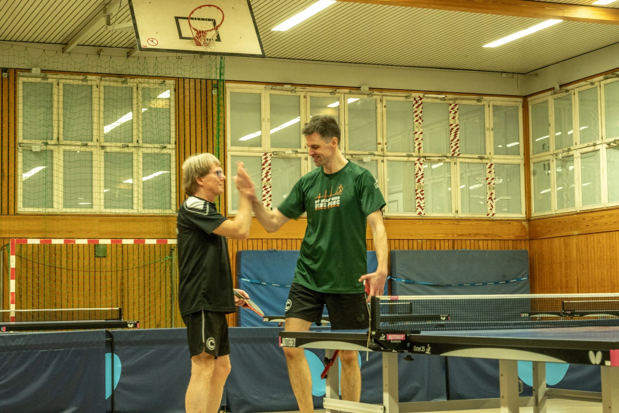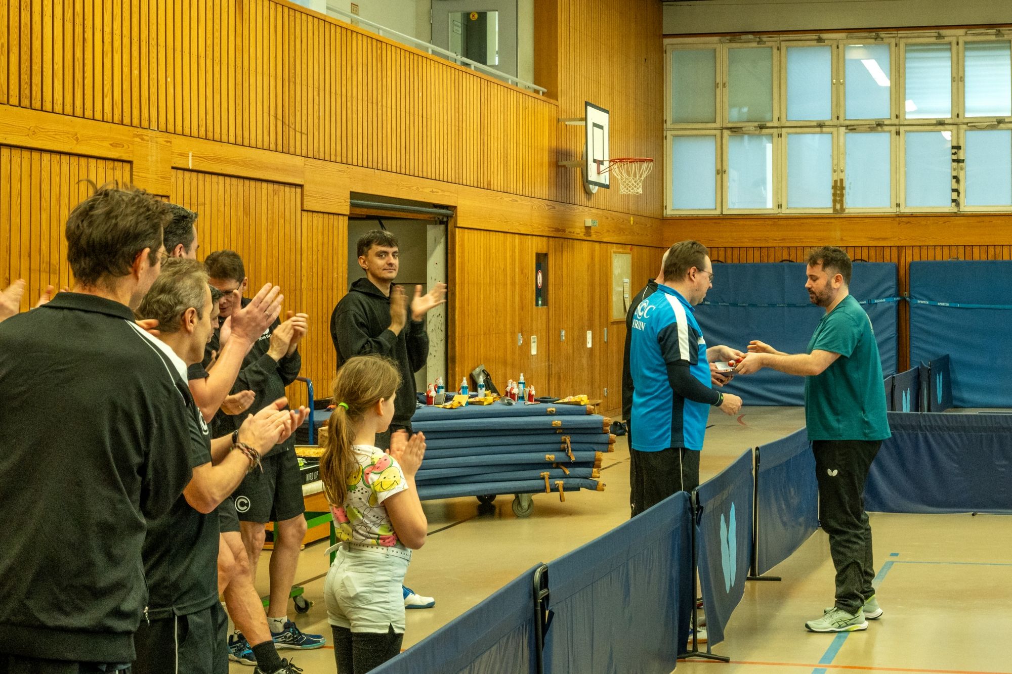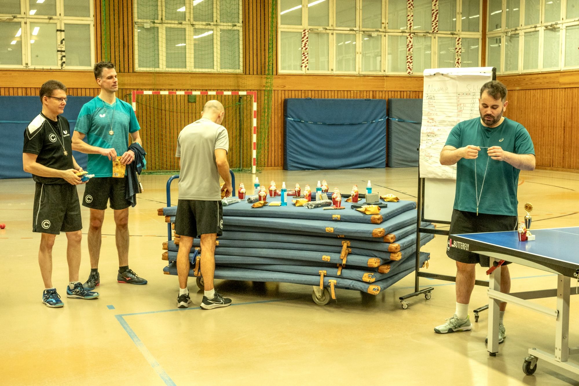 Nach der Begrüßung durch Fritze wurde dann erstmal ein wenig Dankbarkeit gezeigt. Denn ohne unsere ehrenamtlichen Helfer läuft bei uns gar nichts. Hervorgehoben wurden Frank Schweitzer und Hartmut Kästner, die unsere Freizeitgruppe zuverlässig auf Kurs halten, Johann Koschate, der als Hallenschließer für Entlastung bei allen sorgt, sowie Matthias Göbel, der unsere Netze immer wieder in Form bringt. Dafür ein riesiges Dankeschön! Als Vorstand können wir gar nicht oft genug „Danke“ sagen. Vielleicht hilft ja der Gutschein unseres Sponsors PingPongPionier, um zumindest ein kleines Stück zurückzugeben. Danach hieß es: Schleifchen raus, Schläger in die Hand und los geht’s!