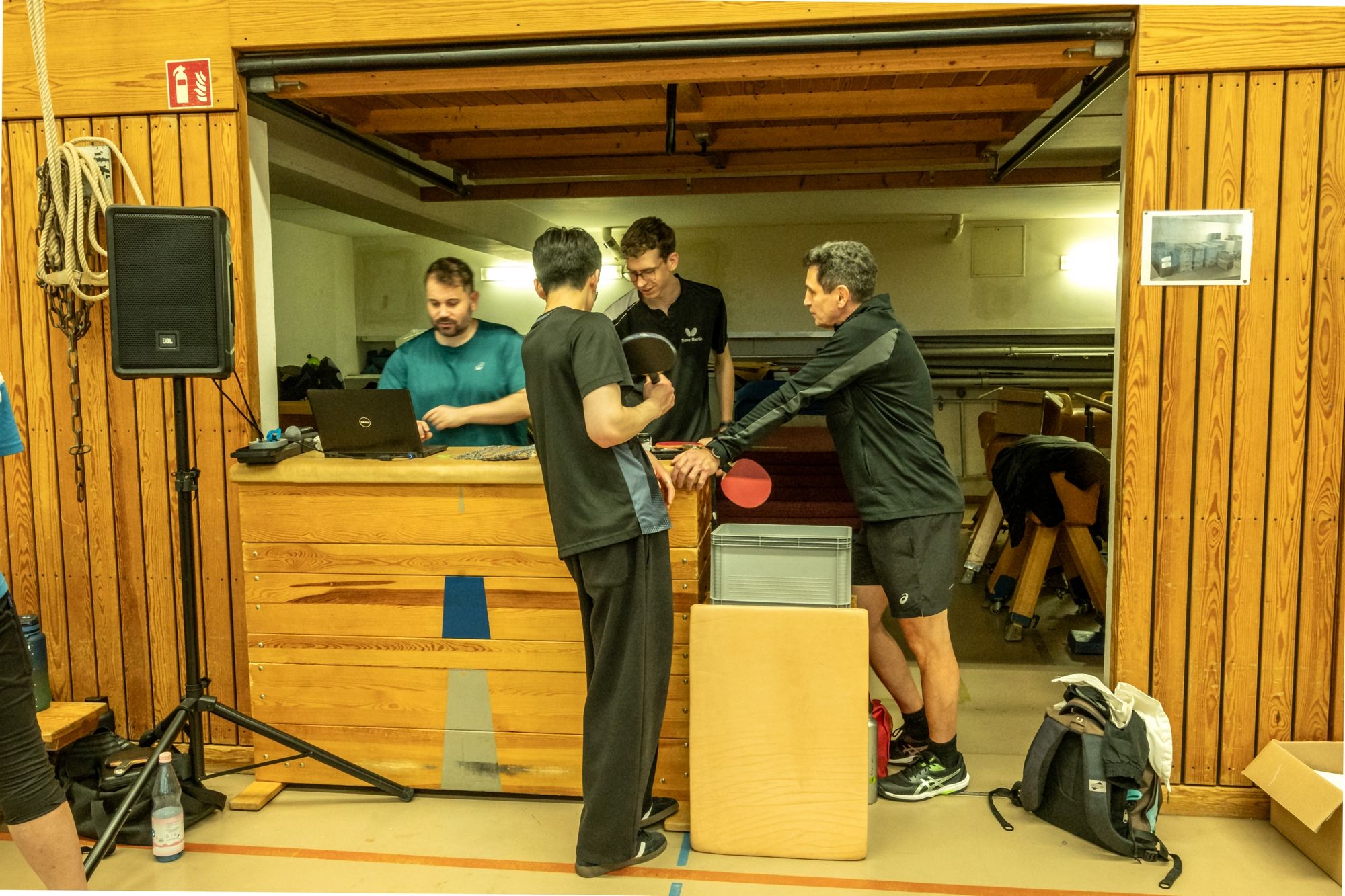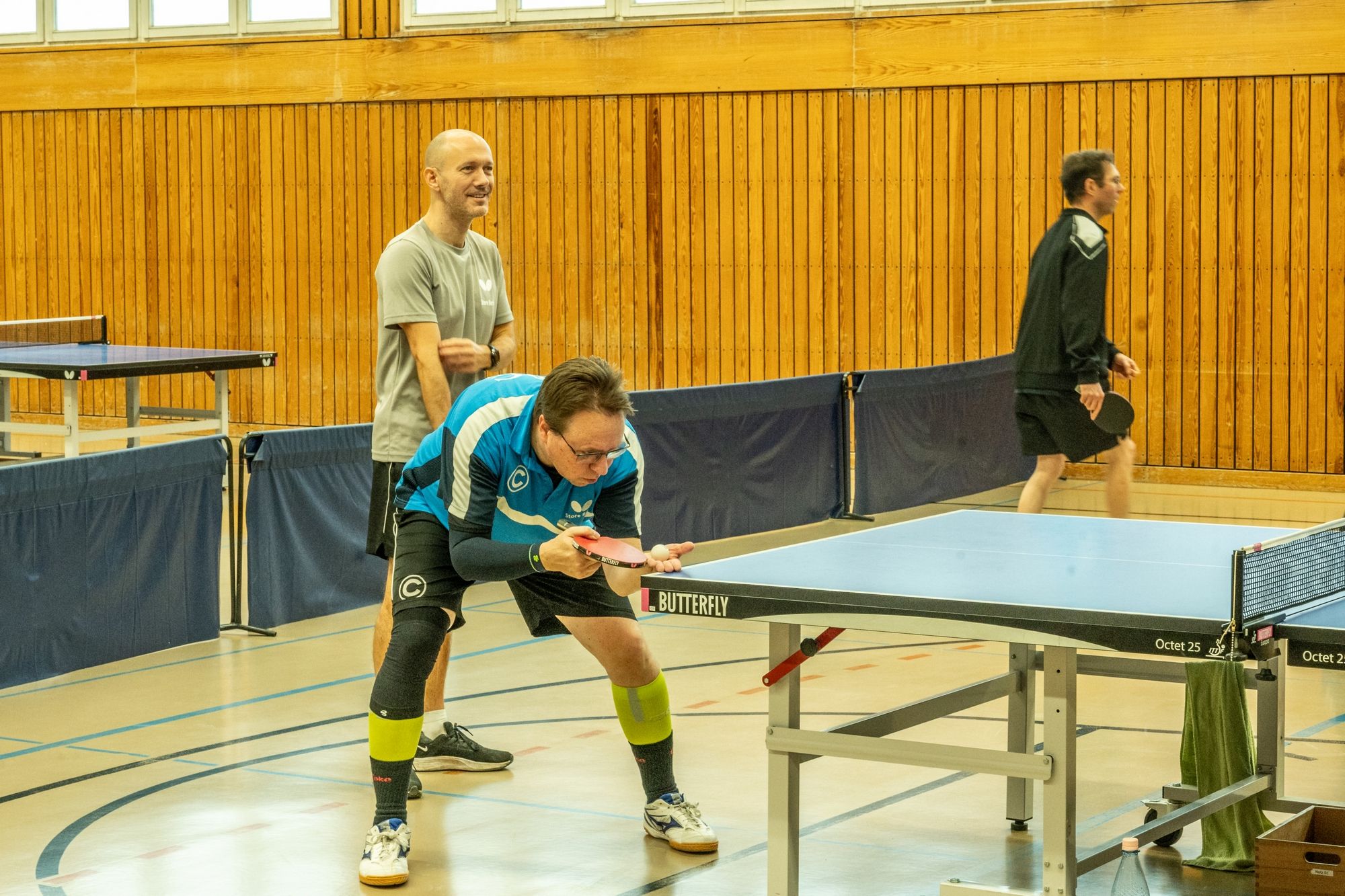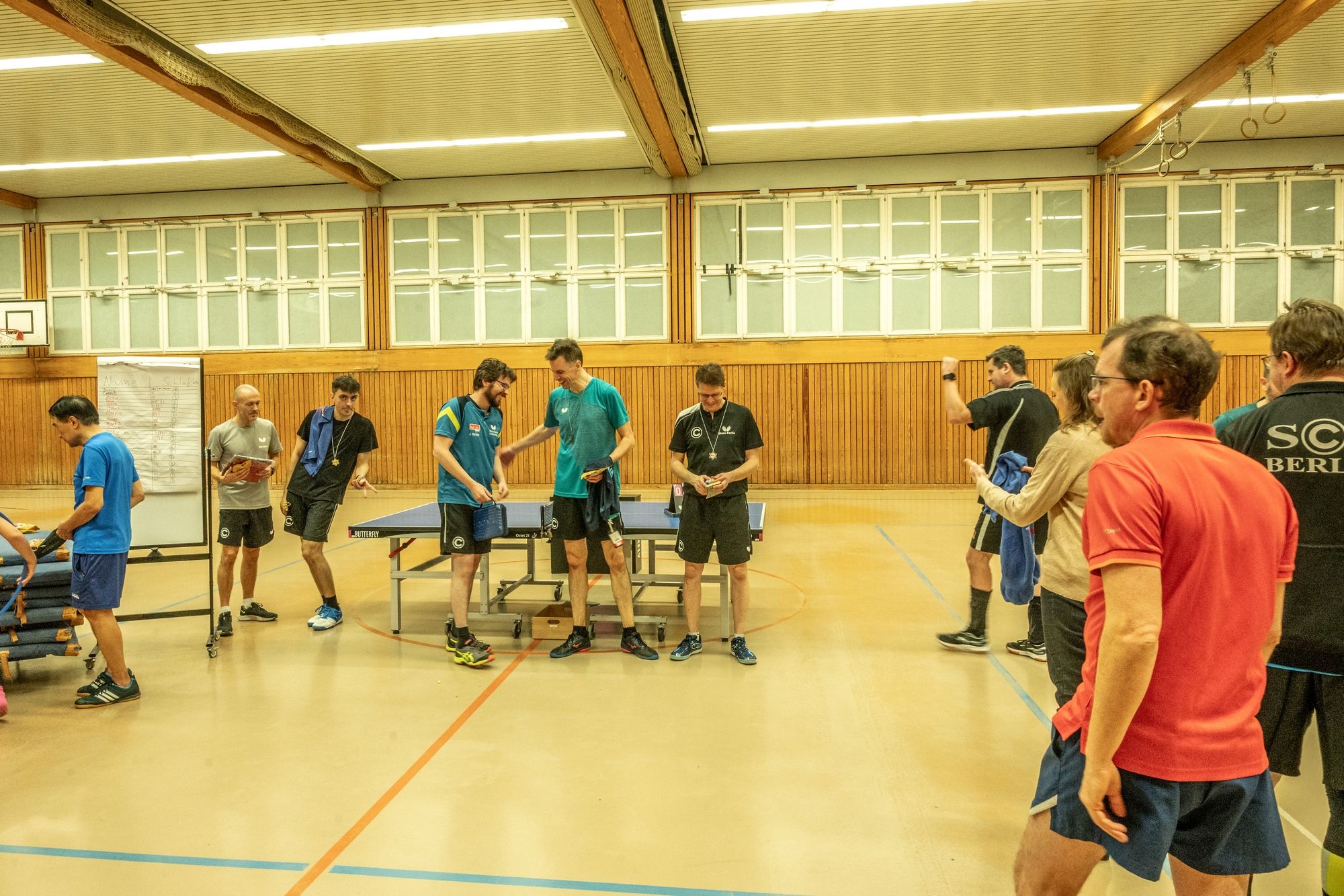 Nach der Begrüßung durch Fritze wurde dann erstmal ein wenig Dankbarkeit gezeigt. Denn ohne unsere ehrenamtlichen Helfer läuft bei uns gar nichts. Hervorgehoben wurden Frank Schweitzer und Hartmut Kästner, die unsere Freizeitgruppe zuverlässig auf Kurs halten, Johann Koschate, der als Hallenschließer für Entlastung bei allen sorgt, sowie Matthias Göbel, der unsere Netze immer wieder in Form bringt. Dafür ein riesiges Dankeschön! Als Vorstand können wir gar nicht oft genug „Danke“ sagen. Vielleicht hilft ja der Gutschein unseres Sponsors PingPongPionier, um zumindest ein kleines Stück zurückzugeben. Danach hieß es: Schleifchen raus, Schläger in die Hand und los geht’s!